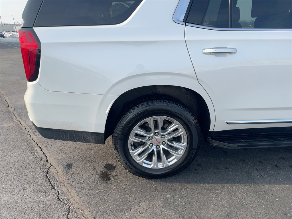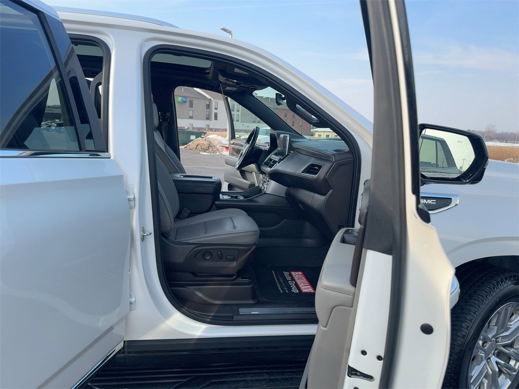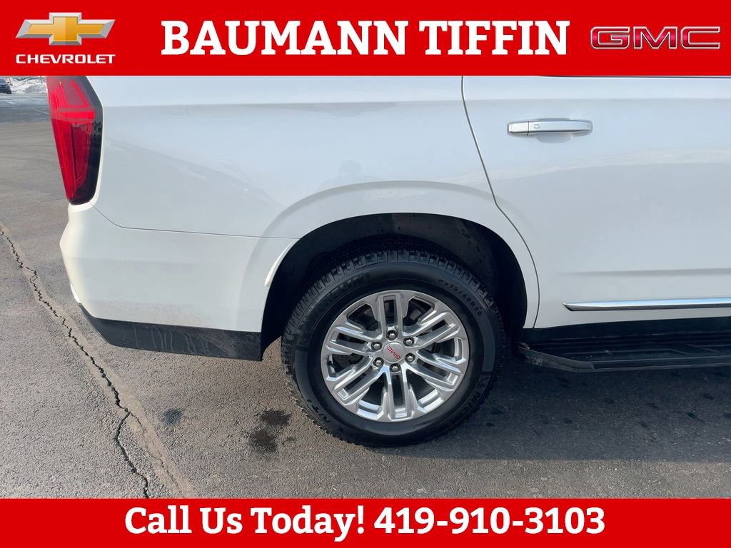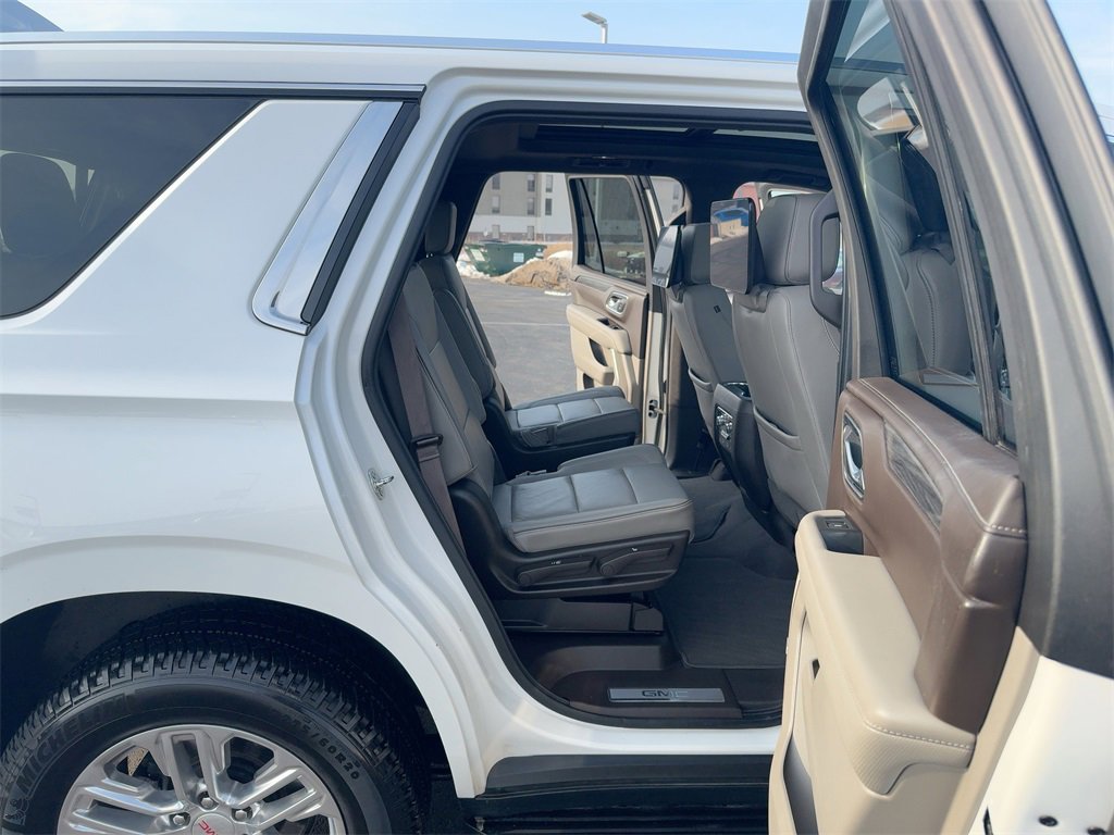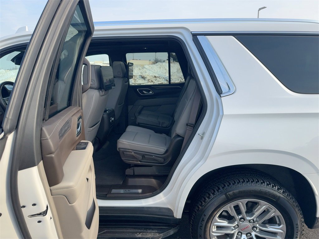 4WD, 12-Way Power Seat Adjusters, 2 Presets For Outside Rearview Mirrors, 2 Presets For Power Driver Seat, 3.23 Rear Axle Ratio, 3rd Row 60/40 Power-Folding Split-Bench Seat, 3rd row seats: split-bench, 4-Wheel Disc Brakes, 9 Speakers, ABS brakes, Air Conditioning, Alloy wheels, AM/FM radio: SiriusXM with 360L, Apple CarPlay/Android Auto, Auto High-beam Headlights, Auto-dimming Rear-View mirror, Automatic Emergency Braking, Automatic temperature control, Bodyside moldings, Bose 9-Speaker Stereo Audio System Feature, Brake assist, Bright Chrome Bodyside Moldings, Bright Front & Rear Door Sill Plates, Bumpers: body-color, Chrome Door Handles w/Body-Color Strip, Compass, Delay-off headlights, Driver door bin, Driver vanity mirror, Dual front impact airbags, Dual front side impact airbags, Dual-Pane Panoramic Power Sunroof, Electronic Stability Control, Emergency communication system: OnStar and GMC connected services capable, Floor Console, Following Distance Indicator, Forward Collision Alert, Four wheel independent suspension, Front & Rear Park Assist, Front anti-roll bar, Front Bucket Seats, Front Center Armrest, Front dual zone A/C, Front fog lights, Front Pedestrian Braking, Front reading lights, Fully automatic headlights, Garage door transmitter, Hands-Free Power Programmable Rear Liftgate, HD Radio, HD Surround Vision, Heated & Ventilated Driver & Front Passenger Seats, Heated 2nd Row Outboard Position Seats, Heated Automatic Steering Wheel, Heated door mirrors, Heated Driver & Front Passenger Seats, Heated front seats, Illuminated entry, Inside Rear-View Auto-Dimming Mirror, IntelliBeam Automatic High Beam On/Off, Lane Change Alert w/Side Blind Zone Alert, Lane Keep Assist w/Lane Departure Warning, Leather steering wheel, Low tire pressure warning, Memory seat, Not Equipped w/Automatic Stop/Start, Not Equipped w/Steering Column Lock, Occupant sensing airbag, Outside Heated Power-Adjustable Mirrors, Outside temperature display, Overhead airbag, Overhead console, Panic alarm, Passenger door bin, Passenger vanity mirror, Perforated Leather Seating Surfaces, Power door mirrors, Power driver seat, Power Liftgate, Power passenger seat, Power Release 2nd Row 60/40 Split-Folding Bench Seat, Power Release 2nd Row Bucket Seats, Power steering, Power Tilt & Telescopic Steering Column, Power windows, Preferred Equipment Group 4SA, Premium Smooth Ride Suspension, Radio: AM/FM/SiriusXM, Radio: AM/FM/SiriusXM w/Navigation, Rain sensing wipers, Rear air conditioning, Rear anti-roll bar, Rear Cross Traffic Alert, Rear Media & Nav Package, Rear Pedestrian Alert, Rear reading lights, Rear seat center armrest, Rear Seat Media System, Rear window defroster, Rear window wiper, Remote keyless entry, Roof rack: rails only, Safety Alert Seat, Security system, SiriusXM w/360L, SLT Luxury Package, SLT Premium Package, Speed control, Speed-sensing steering, Split folding rear seat, Spoiler, Steering wheel mounted audio controls, Tachometer, Telescoping steering wheel, Tilt steering wheel, Traction control, Trip computer, Universal Home Remote, Variably intermittent wipers, Ventilated front seats, Voltmeter, Wheels: 20 x 9 6-Spoke Polished Aluminum, 4WD.